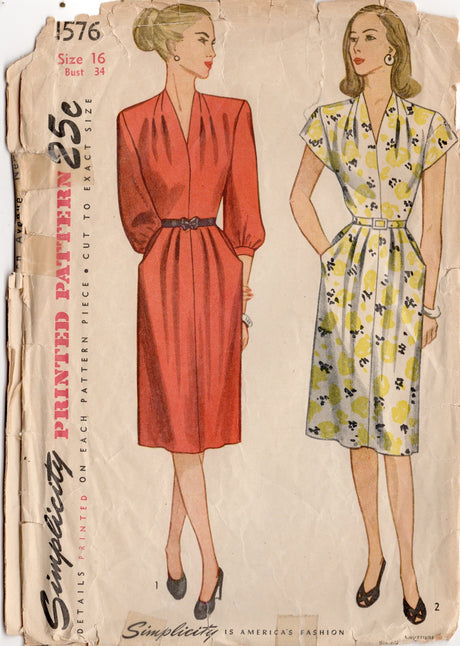 1940's Simplicity Tucked Shoulder One Piece Dress with pockets - Bust 34" - No. 1576