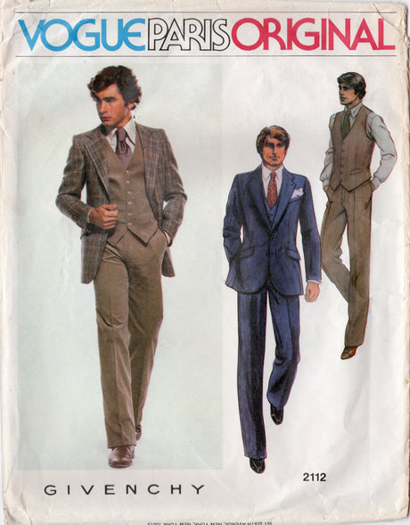 1970's Vogue Paris Original Men's Three Piece Suit Pattern by Givenchy - Chest 38" - No. 2112