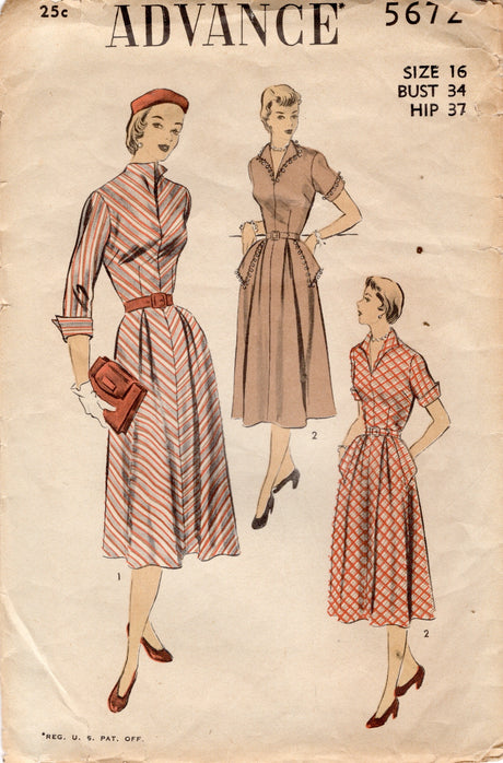 1950's Advance One Piece Dress Pattern with Pockets - Bust 34" - No. 5672