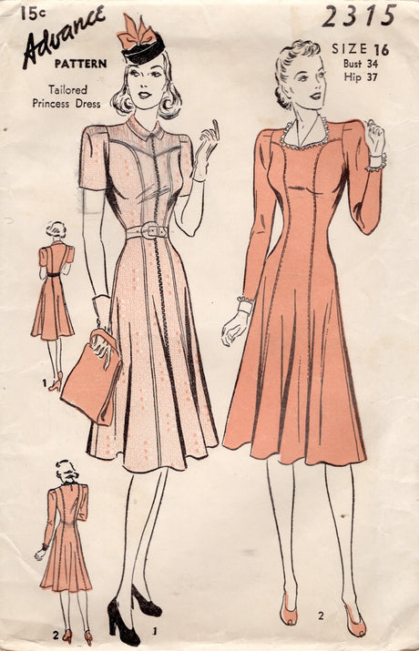 1940's Advance Princess Line Dress with 2 styles of Collars - Bust 34" - No. 2315