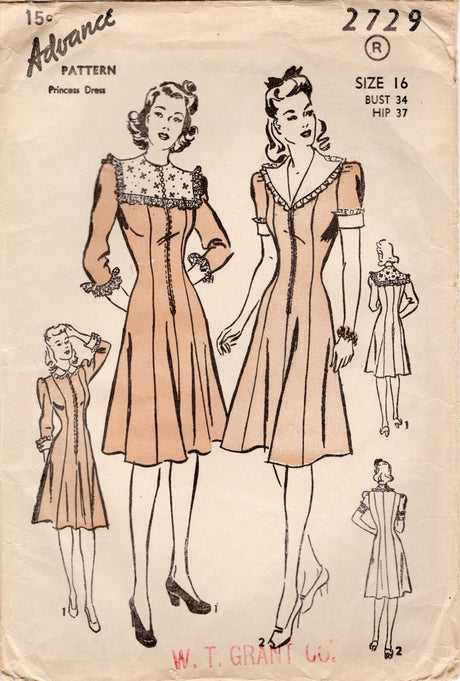 1940's Advance Zip Front Princess Line Dress with 3 styles of Collars - Bust 34" - No. 2729