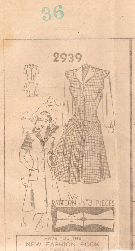 1940's Mail Order Button Up Jumper Dress and Blouse Pattern - Bust 36" - No. 2939