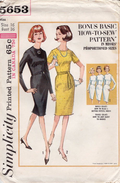 1960's Simplicity Basic Sheath Dress Pattern - Bust 36" - No. 5653