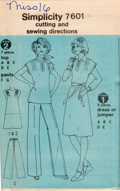 1970's Simplicity Princess Line Pullover Dress, Top and Pants pattern - Bust 38" - No. 7601