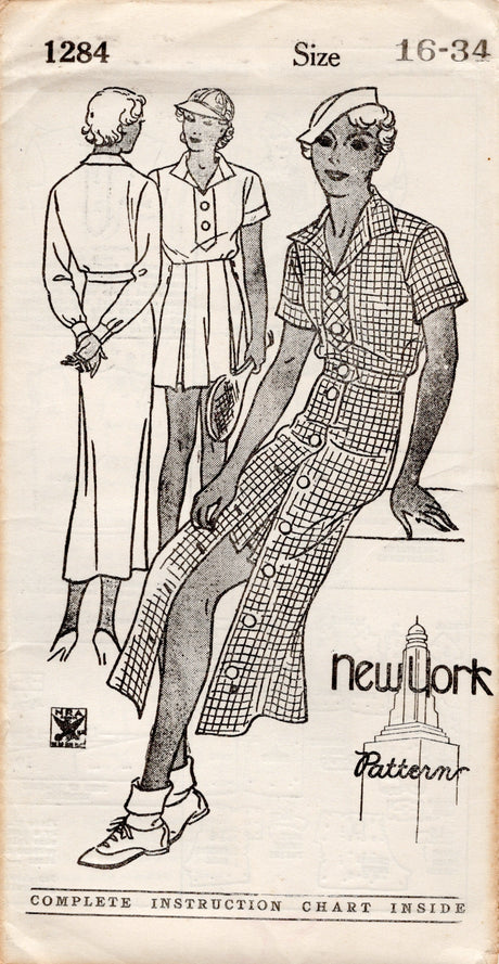 1930's New York Sports Set Pattern with Blouse, Button Up Skirt and Shorts - Bust 34" - No. 1284