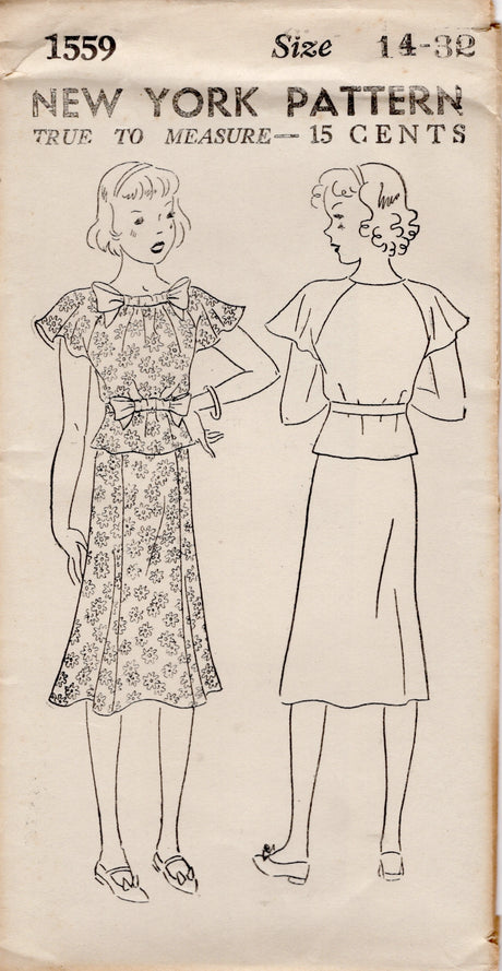 1930's New York Square One Piece Dress Pattern with Button on Bolero Jacket - Bust 36" - No. 1565