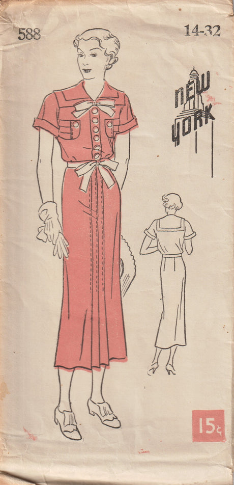 1930's New York Shirtwaist Dress Pattern with Large Collar and Detailed Pocket - Bust 32" - No. 588