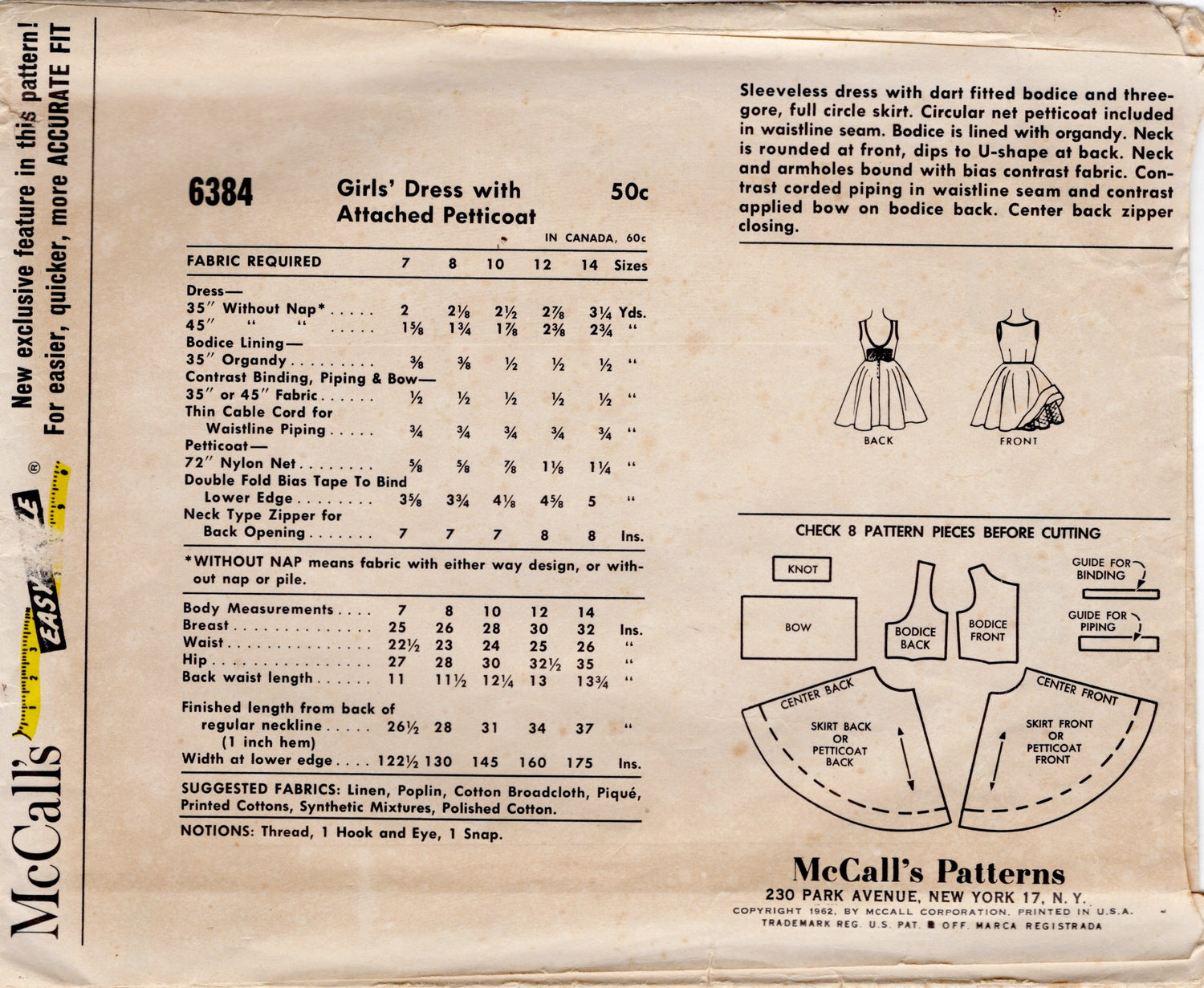 Dress with Attached Petticoat "Easy To Sew". Sleeveless dress with dart fitted bodice and three-gore, full circle skirt. Circular net petticoat included in waistline seam. Bodice is lined with organdy. Neck is rounded at front, dips to U-shape at back. Neck and armholes bound with bias contrast fabric. Contrast corded piping in waistline seam and contrast applied bow on bodice back. Center back zipper closing.