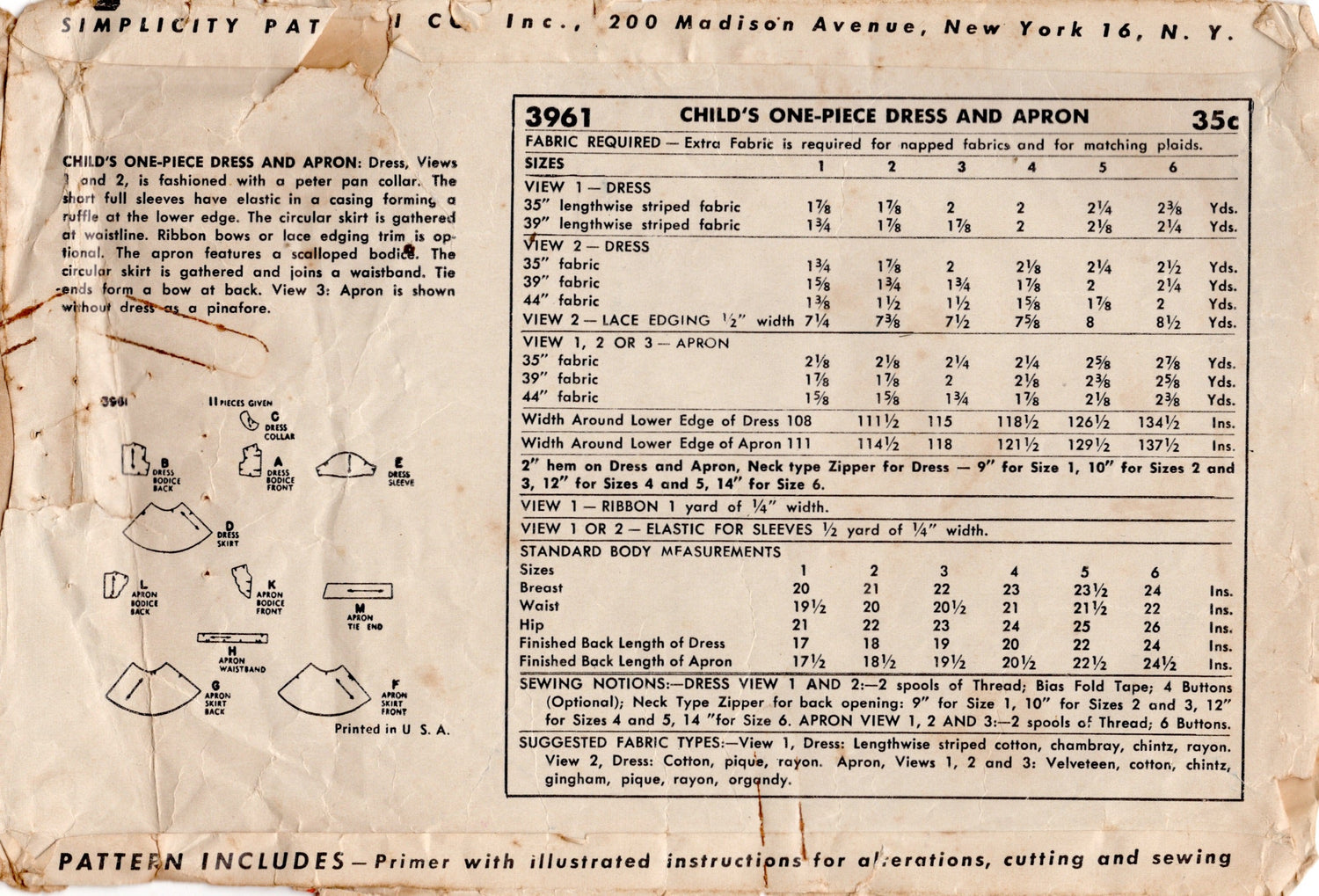 1950's Simplicity Child's Apron Dress Pattern - Chest 22" - No. 3961 is backordered and will ship as soon as it is back in stock.