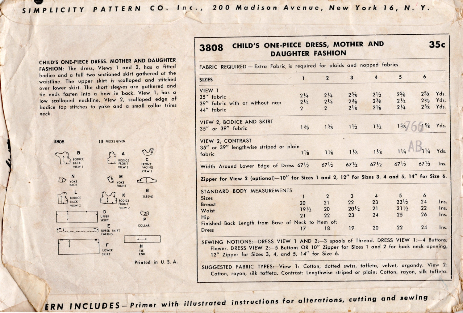 One-Piece Dress, a "Mother and Daughter" Fashion: for Mother's pattern see Simplicity 3791. The dress, View 1 and 2, has a fitted bodice and a full two sectioned skirt gathered at the waistline. The upper skirt is scalloped and stitched over lower skirt. The short sleeves are gathered and tie ends fasten into a bow in back. View 1, has a low scalloped neckline. View 2, scalloped edge of bodice top stitches to yoke and a small collar trims neck.