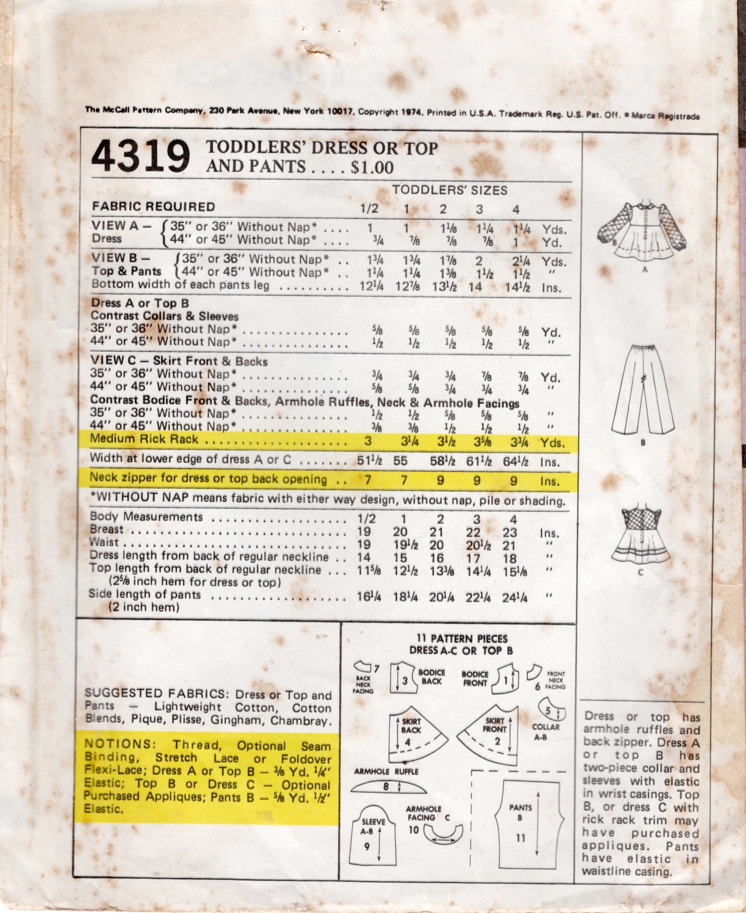 1970's McCall's Child's Yoked Dress or Top and Pants pattern - Chest 19" - No. 4319 is backordered and will ship as soon as it is back in stock.
