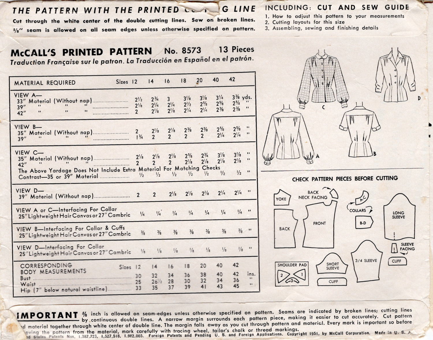 1950's McCall's Button Up Blouse Pattern - Bust 34" - No. 8573 is backordered and will ship as soon as it is back in stock.