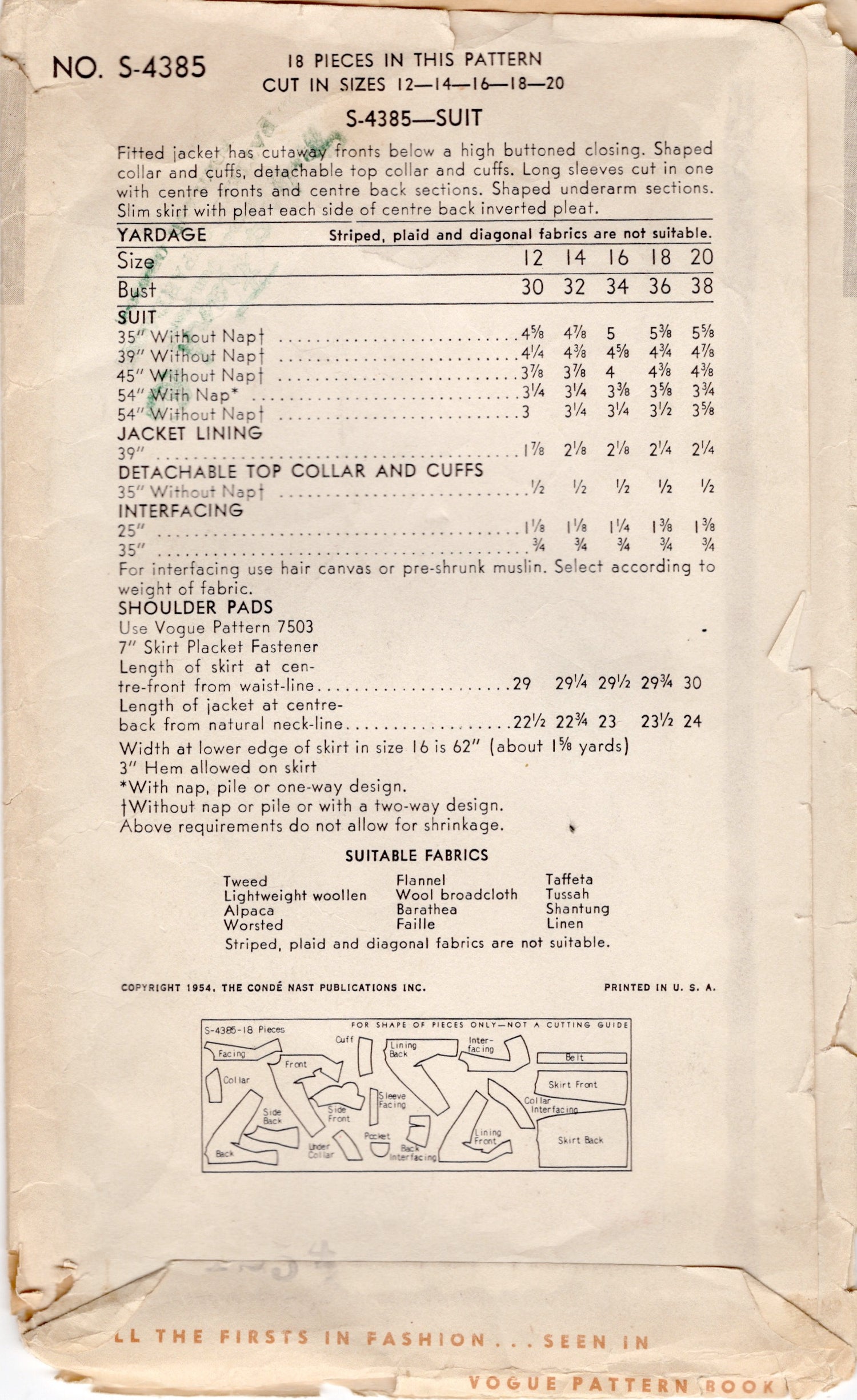1950's Vogue Special Design Two Piece Suit Dress Pattern - Bust 32" - No. S-4385 is backordered and will ship as soon as it is back in stock.