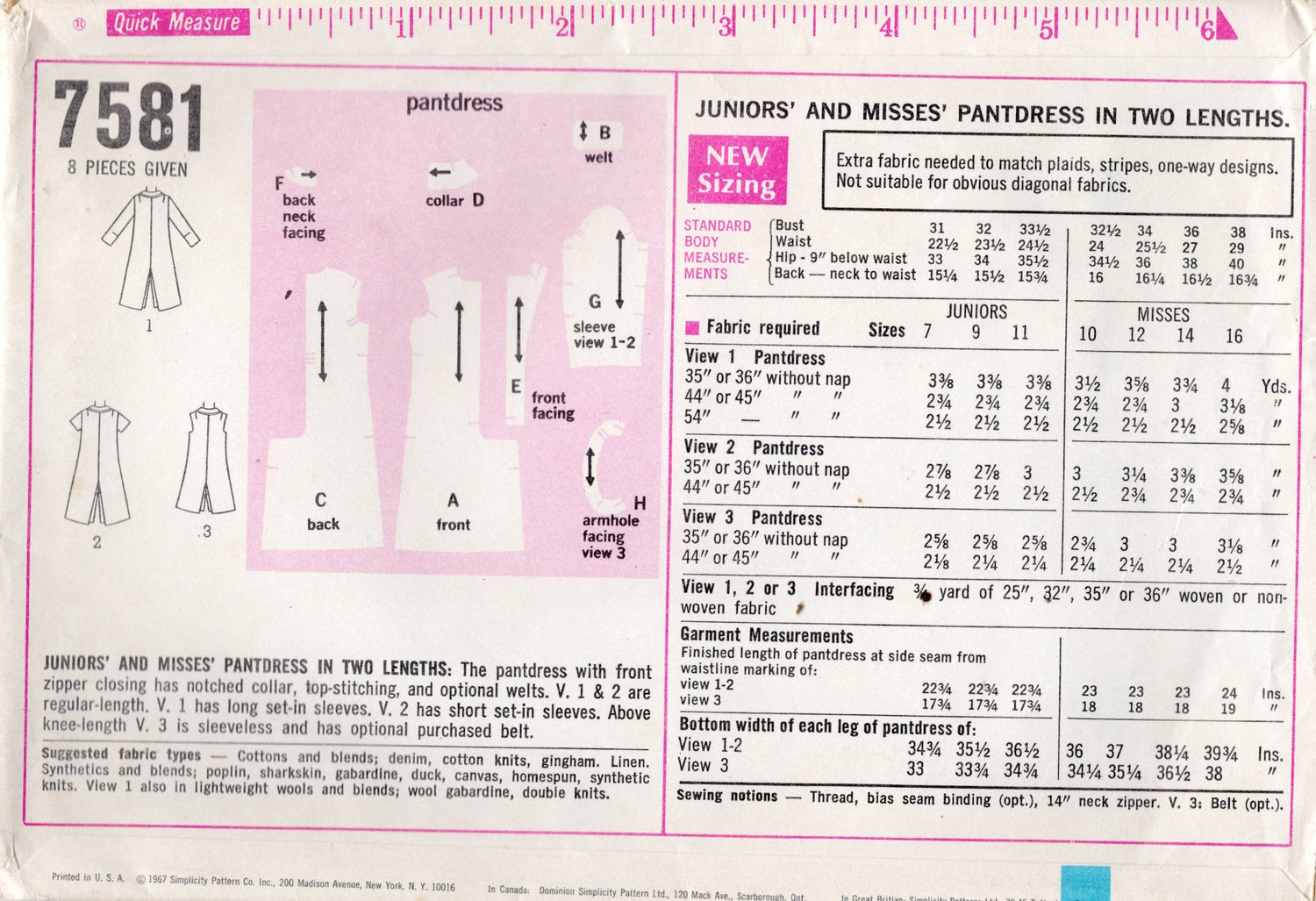 1960's Simplicity Romper (Pantdress) Pattern with two sleeve lengths - Bust 32.5" - No. 7581