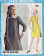 One-Piece Dress. Loose-fitting slightly A-Line dress with front button closing, has pocket in right side front seam. Rolled shaped collar. Short or seven-eighths length sleeves. Version A has contrast detachable collar and cuffs.