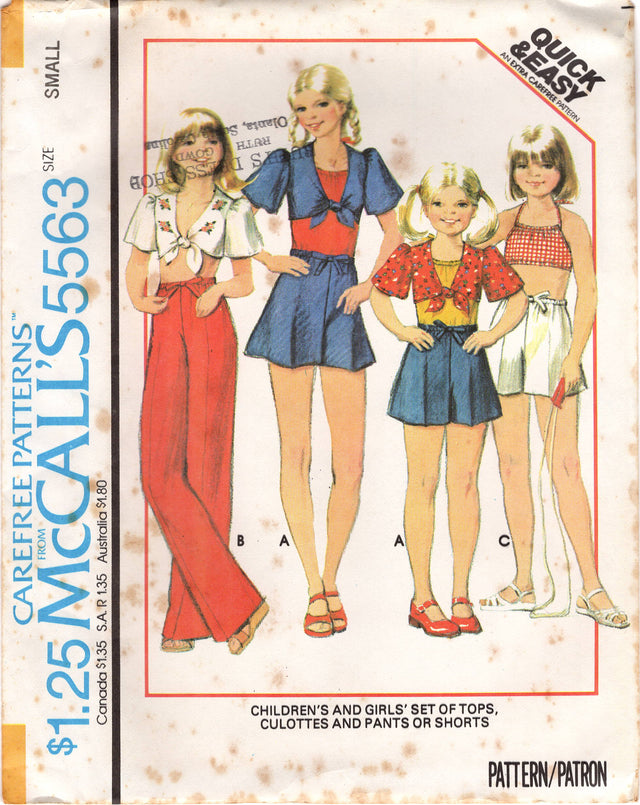 1970's McCall's Child's Summer Blouse with Front Ties and Culottes, Pants or Shorts - Chest 25-32" - No. 5563 - Ex-Small is backordered and will ship as soon as it is back in stock.