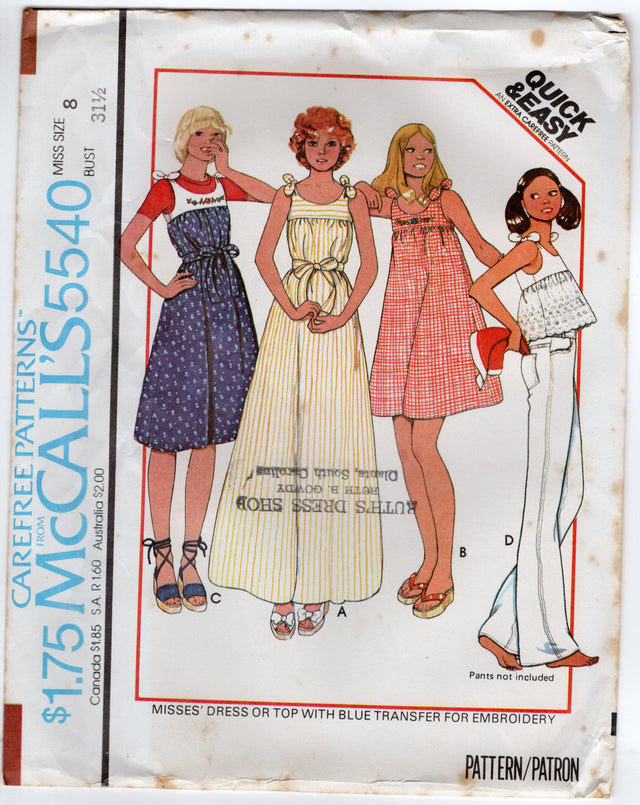 1970's McCall's Yoked Tie Shoulder Maxi, Midi Dress or Blouse pattern with embroidery transfer - Bust 31.5-34" - No. 5540 - Bust 31.5" is backordered and will ship as soon as it is back in stock.