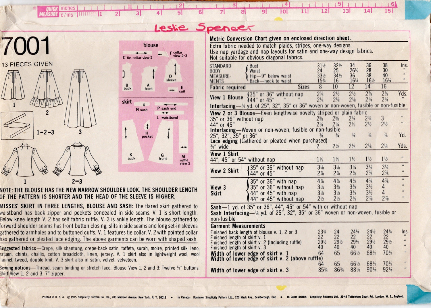 1970's Simplicity Button Up Blouse, Sash and Skirt in Three Lengths - Bust 36" - No. 7001