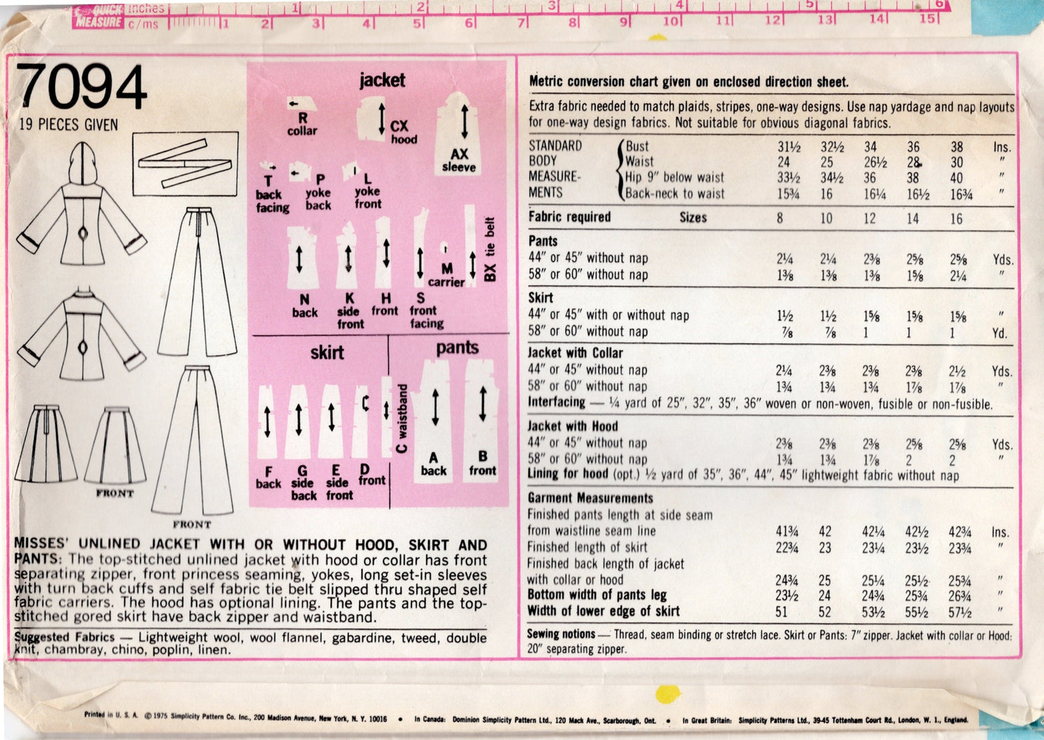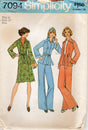 1970's Simplicity Unlined Jacket with or without Hood, Skirt and Pants Pattern - Bust 36" - No. 7094 is backordered and will ship as soon as it is back in stock.