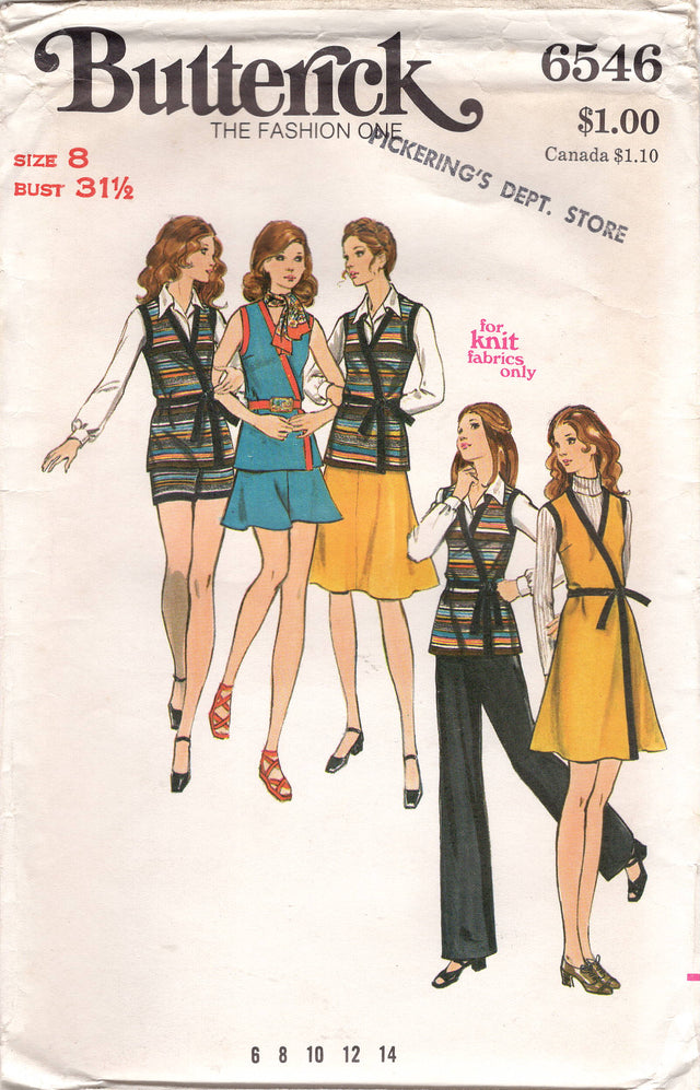 1970's Butterick Crossover Front Jumper Dress, High waisted pants or Shorts and A line Skirt Pattern - Bust 31.5" - No. 6546 is backordered and will ship as soon as it is back in stock.