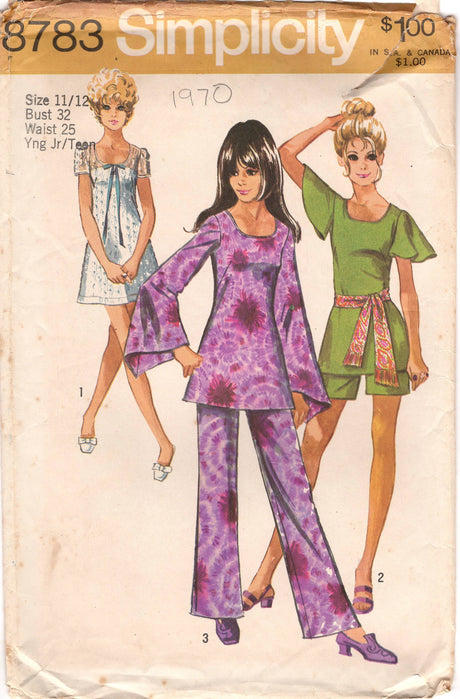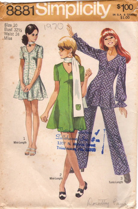 1970's Simplicity Mini Dress with Short or Long Sleeves and Pants or Shorts - Bust 32.5" - 8881