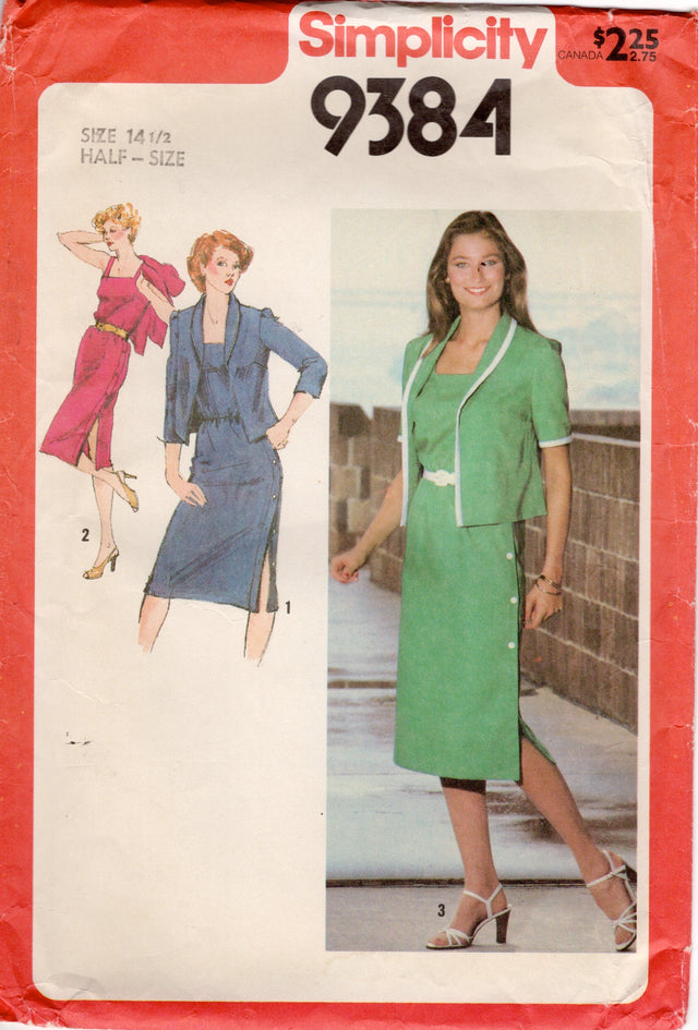 1980’s Simplicity Side Button Dress and Unlined Jacket Pattern - Bust 37” - No. 9384 is backordered and will ship as soon as it is back in stock.