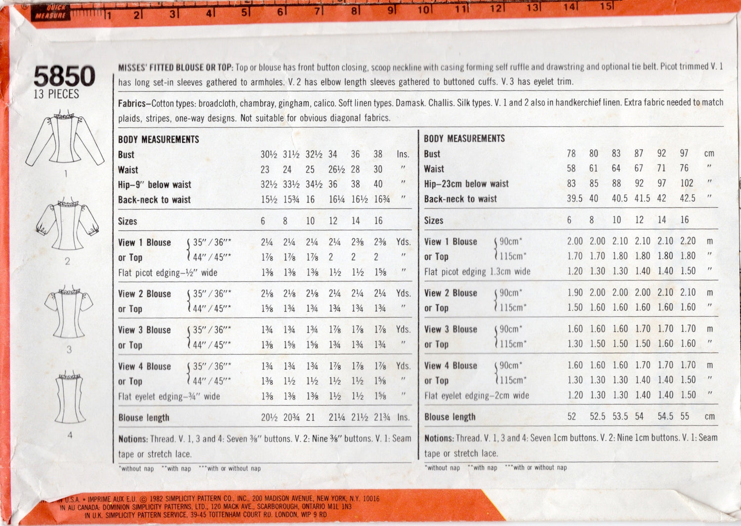 1980's Simplicity Princess line Button Up Blouse with 4 Sleeve Styles - Bust 32.5" - No. 5850 is backordered and will ship as soon as it is back in stock.