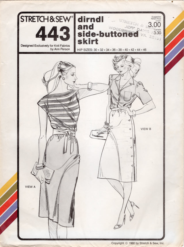 1980's Stretch & Sew Dirndl and Side Buttoned Skirts pattern - Waist 20-37" - No. 443 is backordered and will ship as soon as it is back in stock.