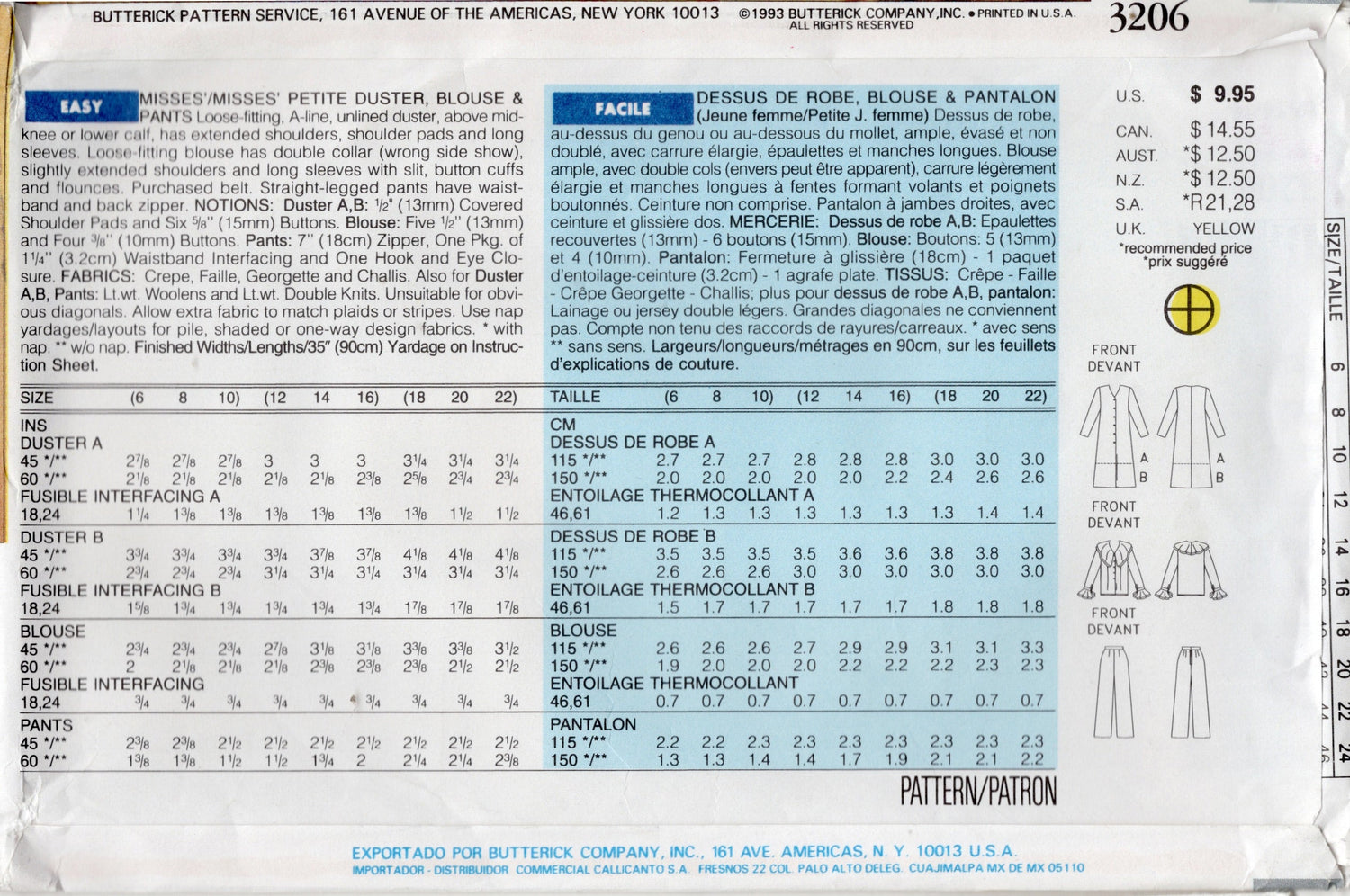 1990's Butterick Duster Jacket, Pants and V-Neck Shirt with large Collar Pattern - Bust 34-38" - No. 3206 is backordered and will ship as soon as it is back in stock.
