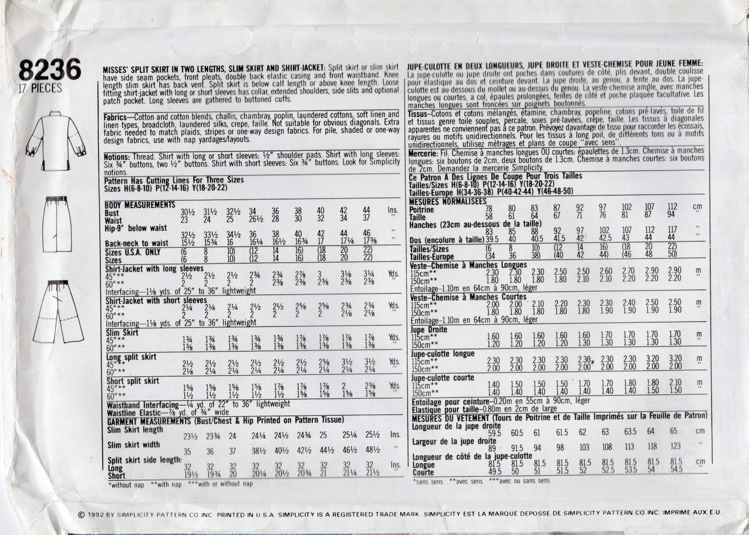 1990's Simplicity Spilt Skirt, Pencil Skirt and Shacket Pattern - Bust 40-44" - No. 8236 is backordered and will ship as soon as it is back in stock.