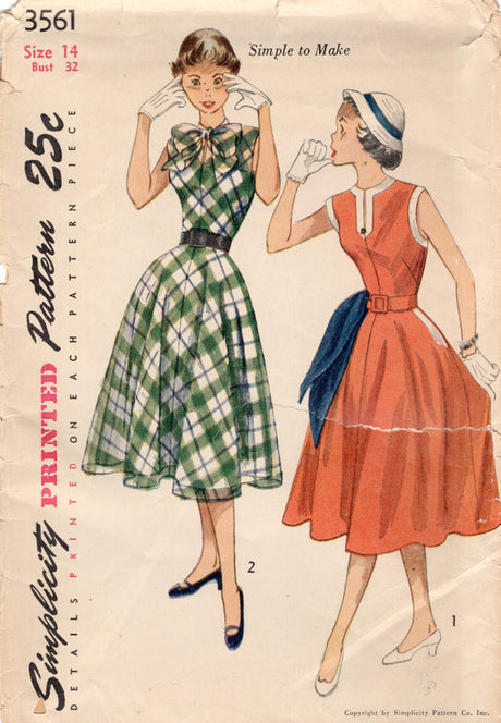 1950's Simplicity Fit and Flare Dress Pattern with Banded Detail or Pussy Bow - Bust 32" - No. 3561