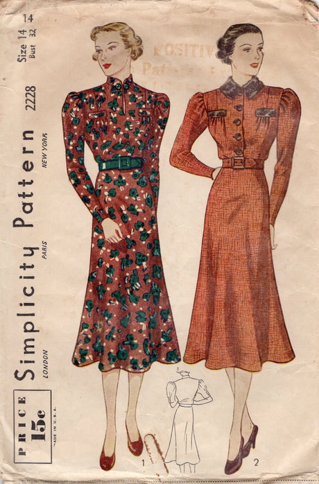Very low stock (1 unit)$2795Unit price /Unavailable1930's Simplicity Shirtwaist Dress Pattern with Puff or Leg of Mutton Sleeves - Bust 32" - No. 2228