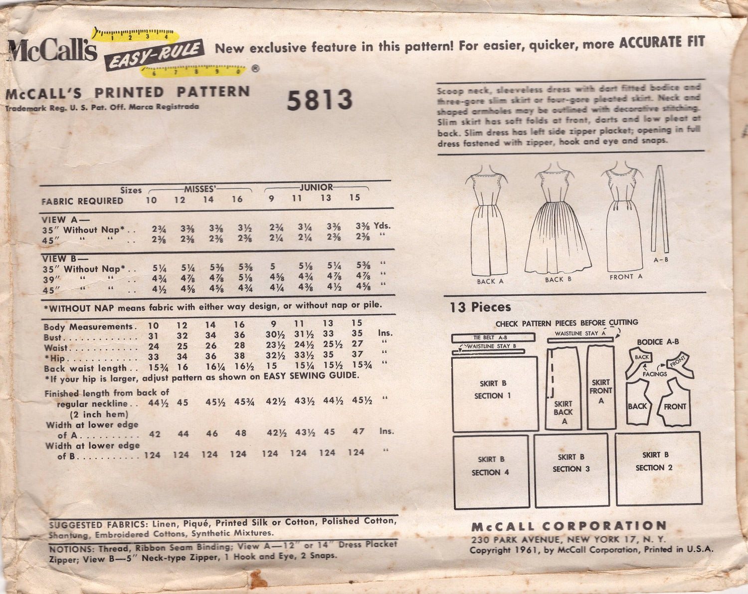1960's McCall's Scoop Neckline Dress with Slim or Pleated Skirt Pattern - Bust 32" - No. 5813 is backordered and will ship as soon as it is back in stock.