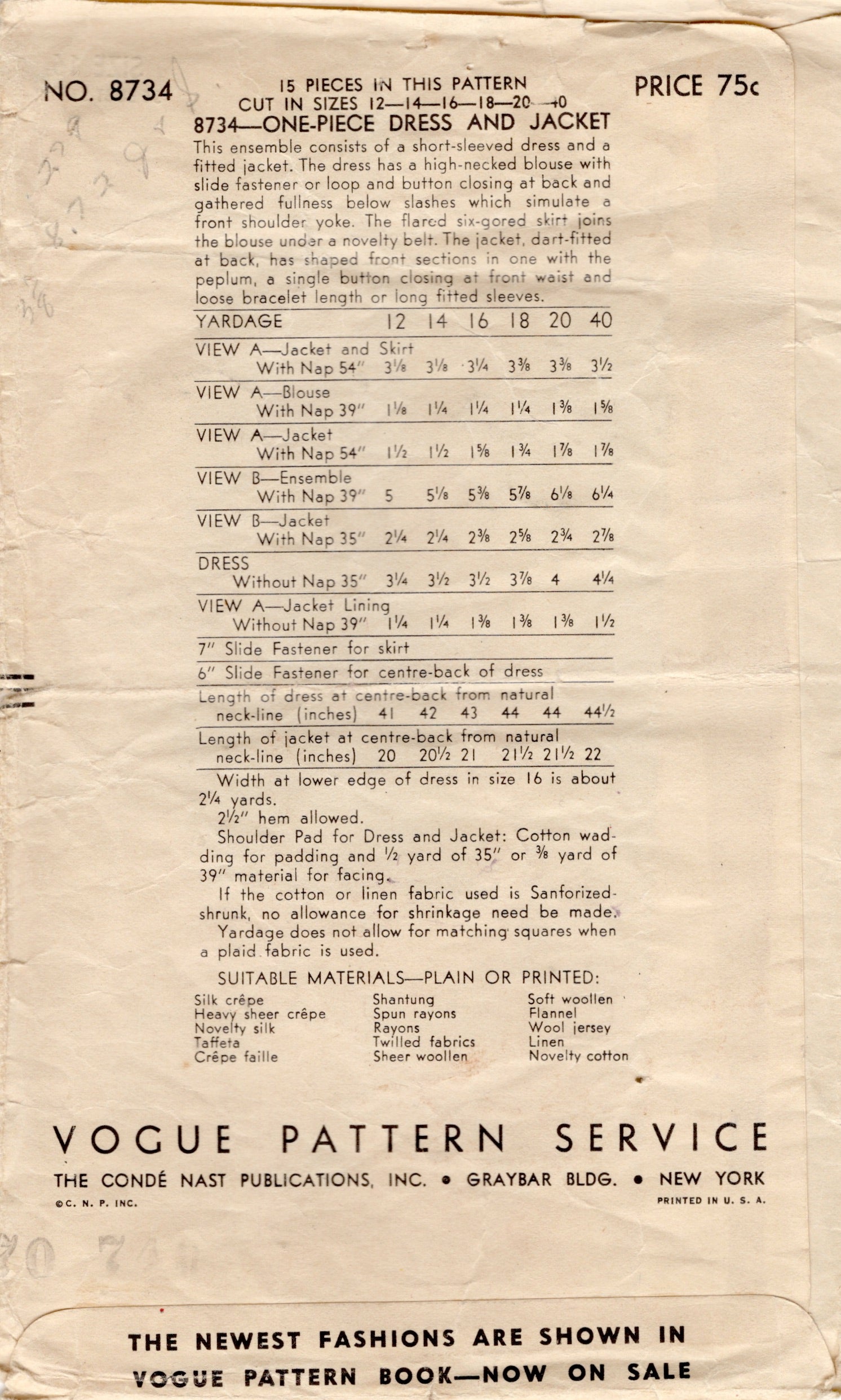 Pattern: MISSING all Jacket. Dress is complete. Unprinted tissue. Skirt Side Front has a 3" tear. Front Facing torn in half, and pinned together so neither section got lost. Comes with instructions.
