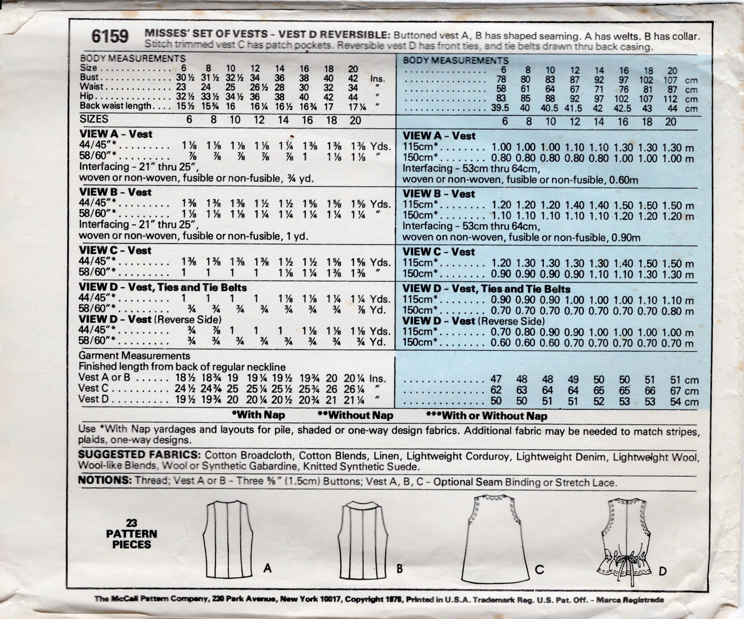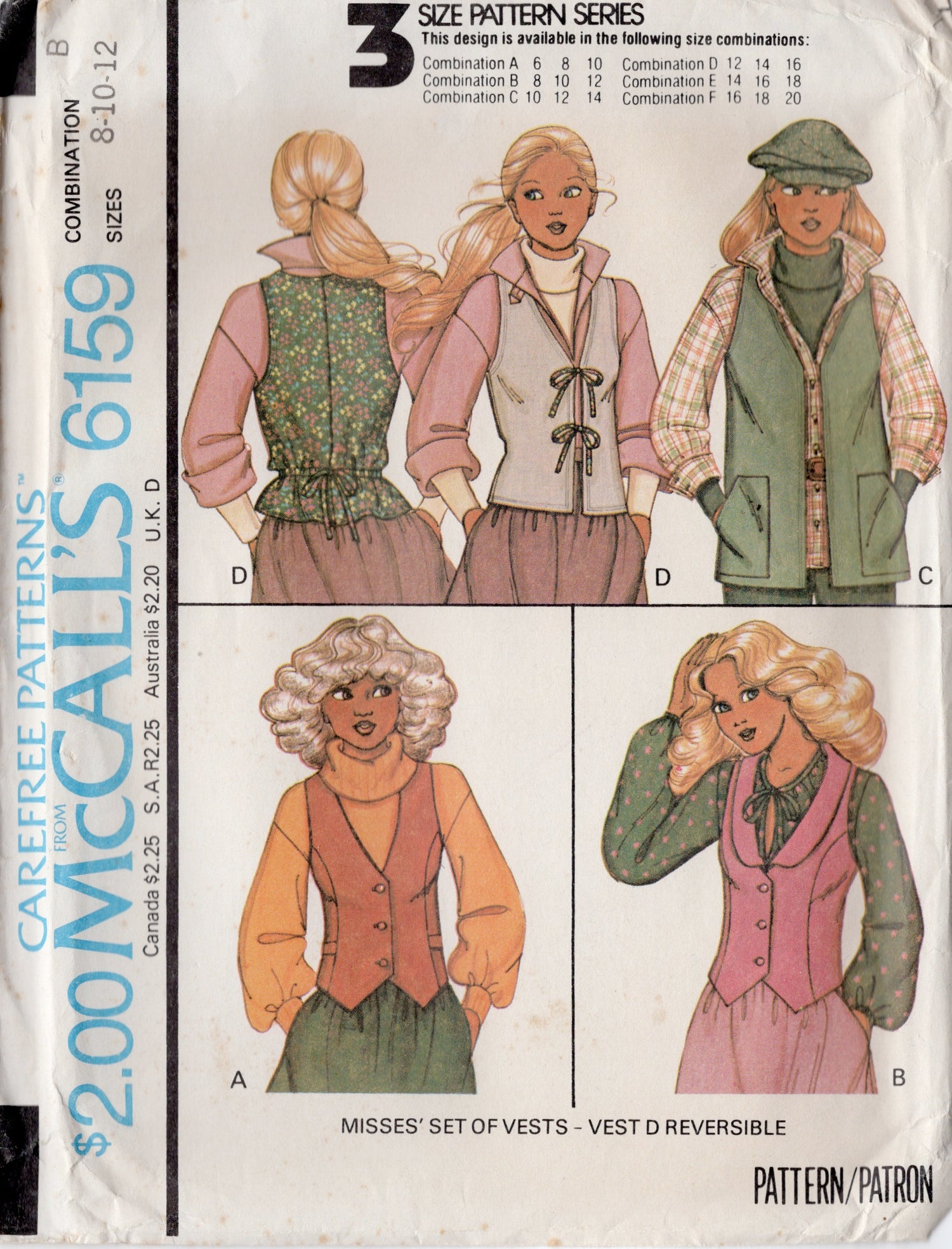 1970's McCall's Set of Vests pattern - Bust 31.5-34" - No. 6159 is backordered and will ship as soon as it is back in stock.