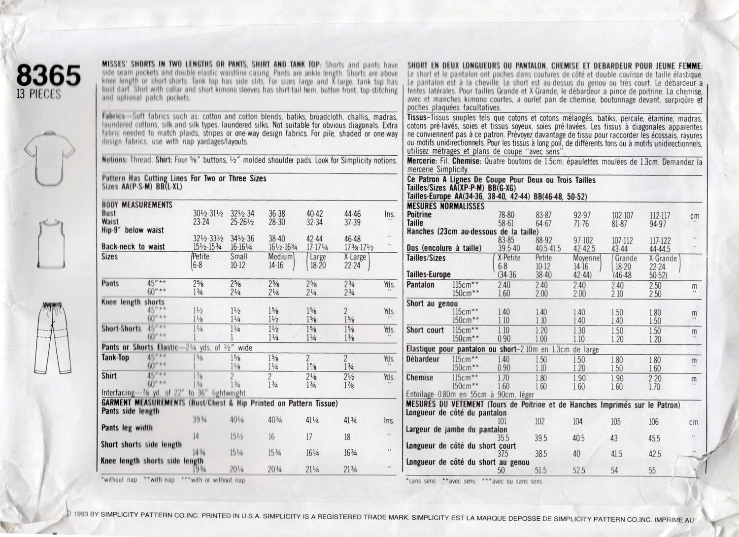 1990's Simplicity Button Up Shirt, Tank Top, Pants or Shorts Pattern - Bust 30.5-38" - No. 8365 is backordered and will ship as soon as it is back in stock.