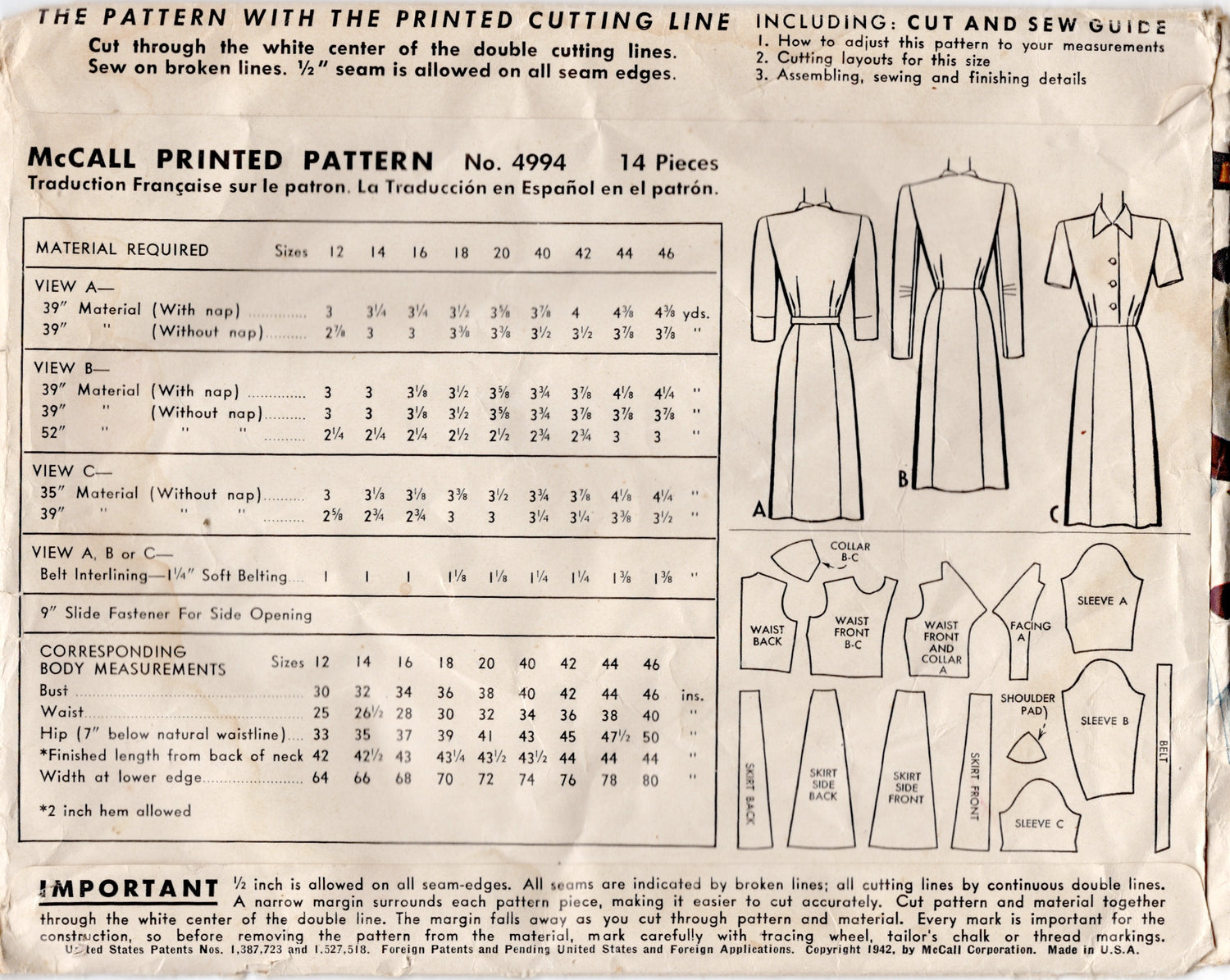 1940's McCall's Shirtwaist Dress Pattern with Two Collar Styles - Bust 36" - No. 4994 is backordered and will ship as soon as it is back in stock.