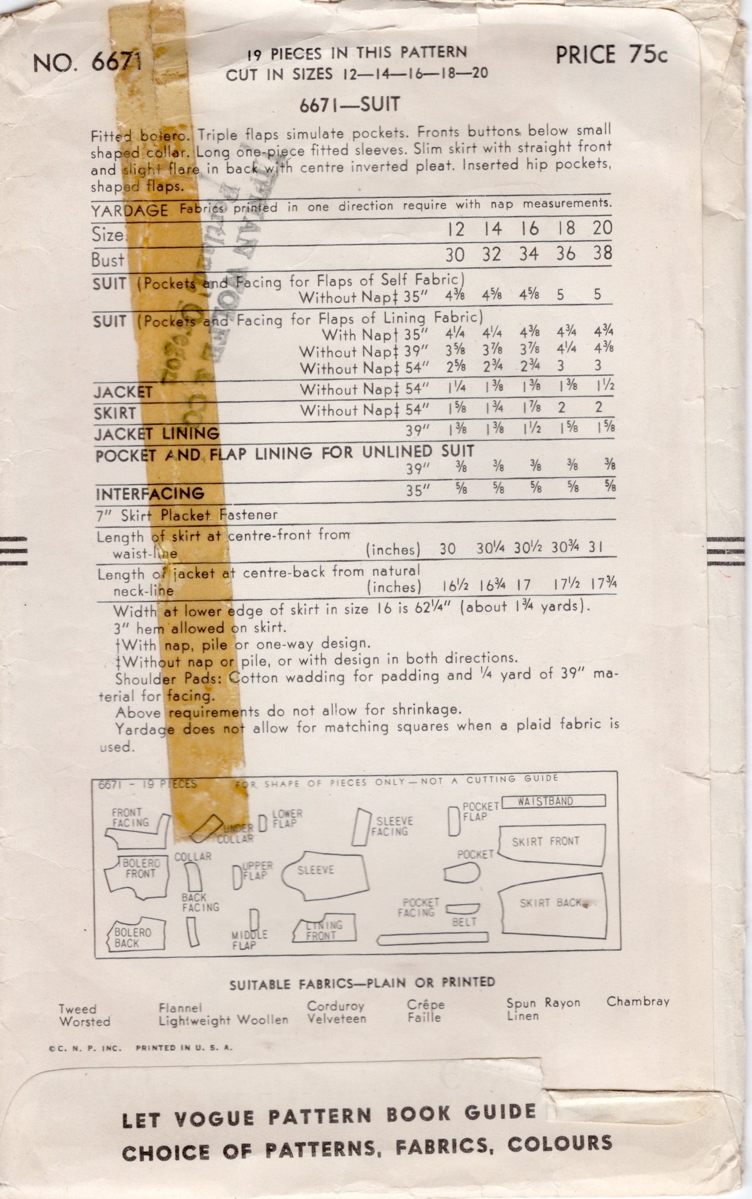 1940's Vogue Bolero Jacket and Slim Skirt pattern - Bust 36" - No. 6671