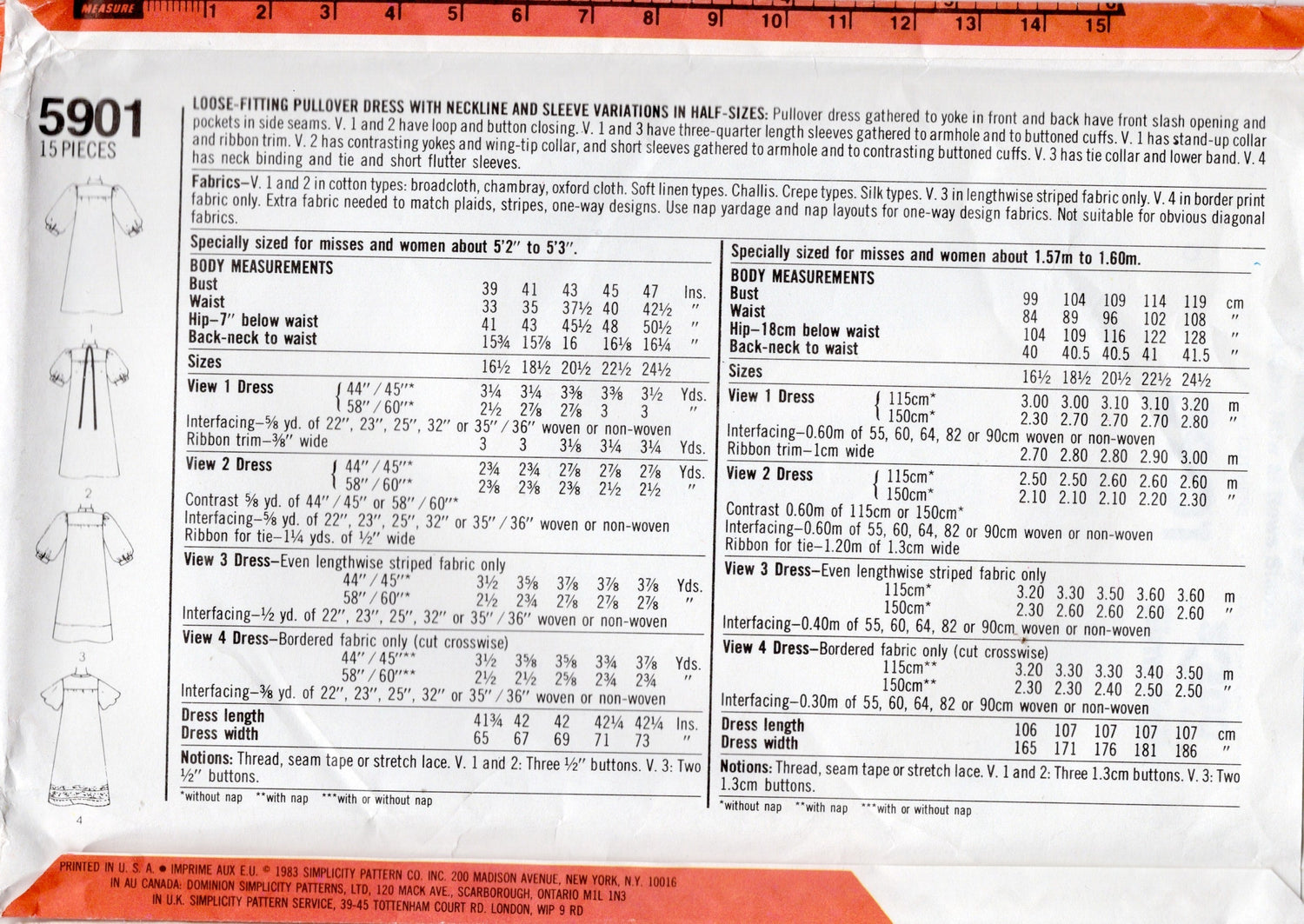 1980's Simplicity Pullover Dress Pattern - Bust 39-43" - No. 5901 is backordered and will ship as soon as it is back in stock.