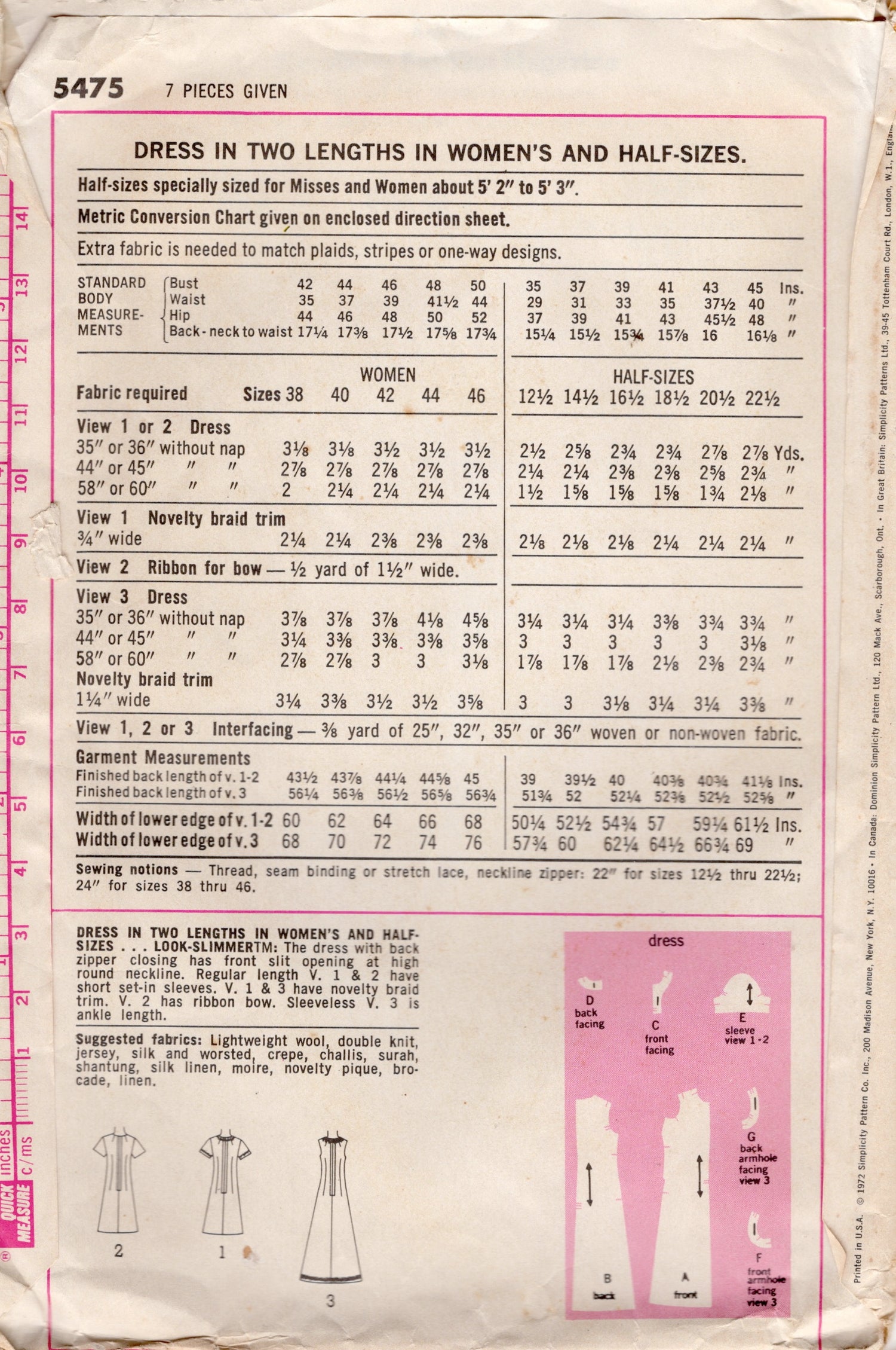 Dress in Two Lengths in Women's and Half-Sizes ... Look-Slimmer: The dress with back zipper closing has front slit opening at high round neckline. Regular length V. 1 & 2 have short set-in sleeves. V. 1 & 3 have novelty braid trim. V. 2 has ribbon bow. Sleeveless V. 3 is ankle length.
