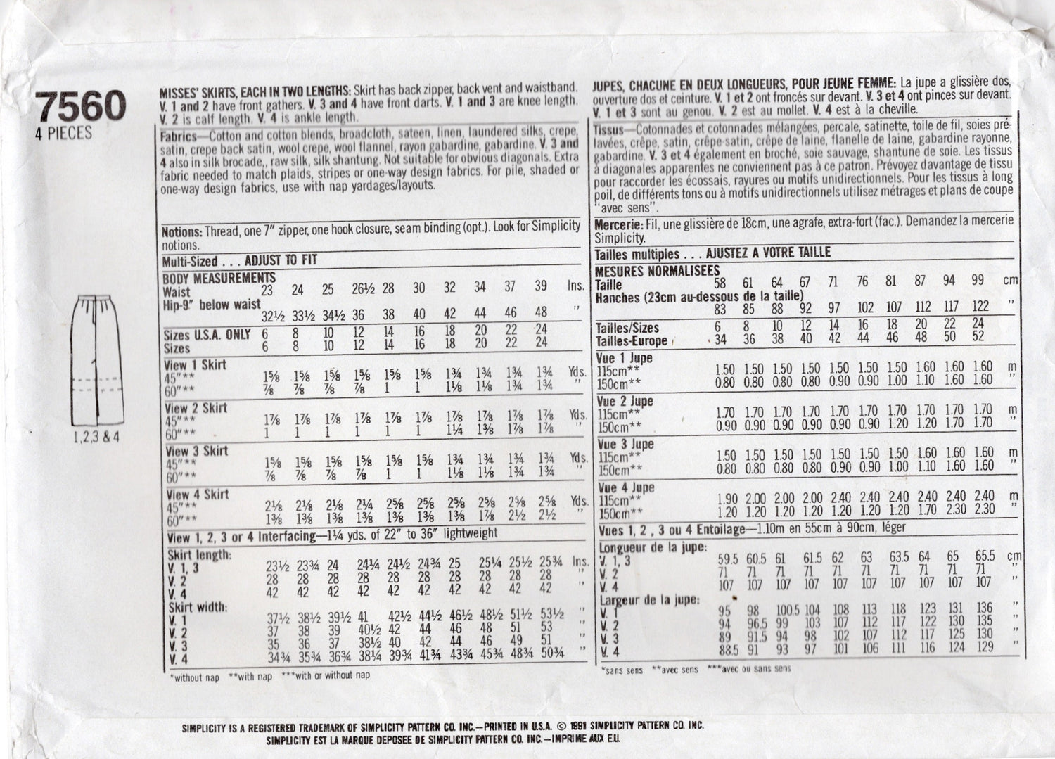 SKIRTS, EACH IN TWO LENGTHS: Skirt has back zipper, back vent and waistband V. 1 and 2 have front gathers. V. 3 and 4 have front darts. V. 1 and 3 are knee length. V. 2 is calf length. V. 4 is ankle length.