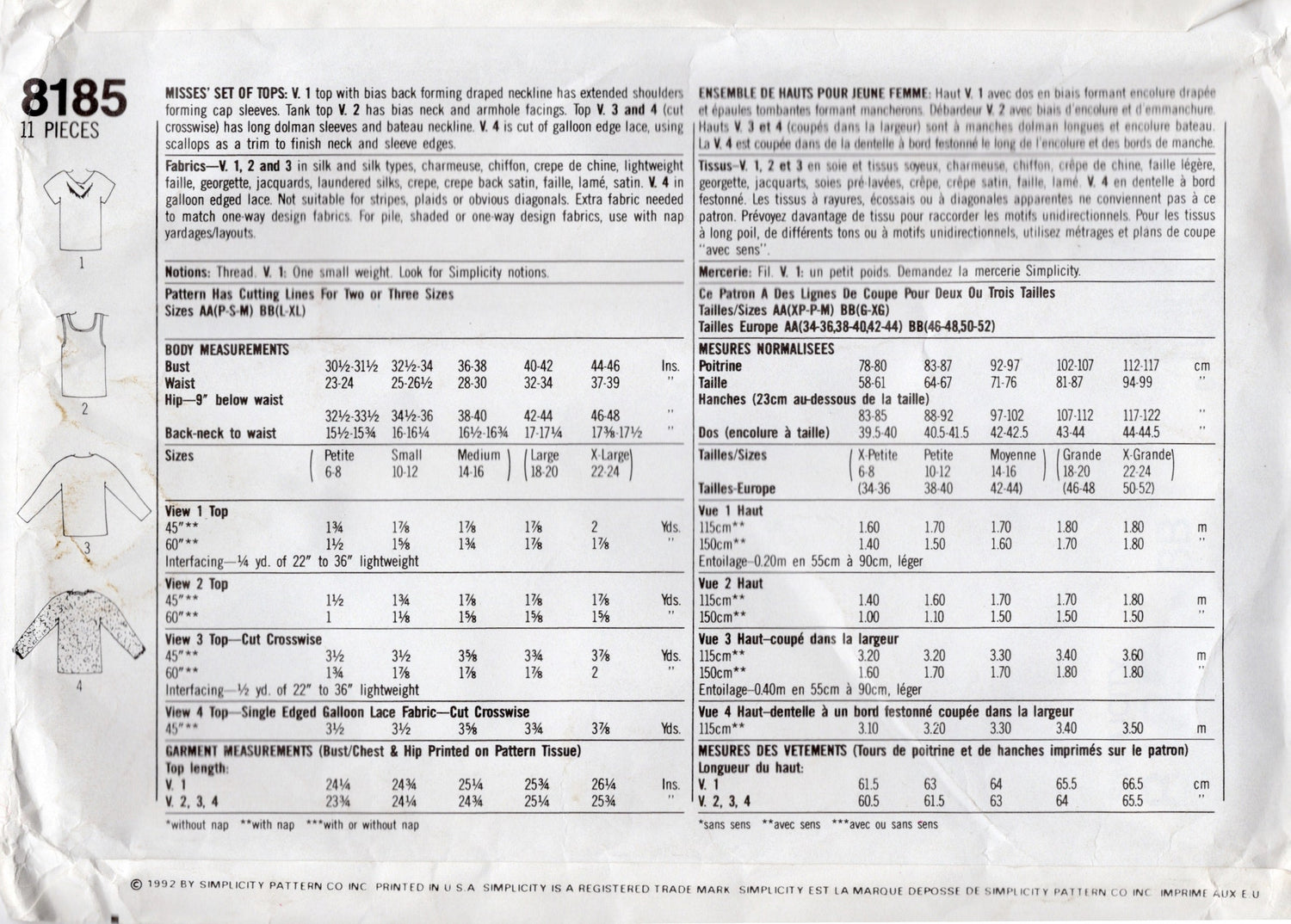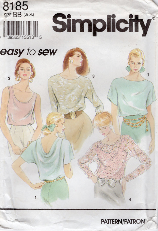 1990's Simplicity Set of Pullover Tops Pattern - Bust 40-46" - No. 8185