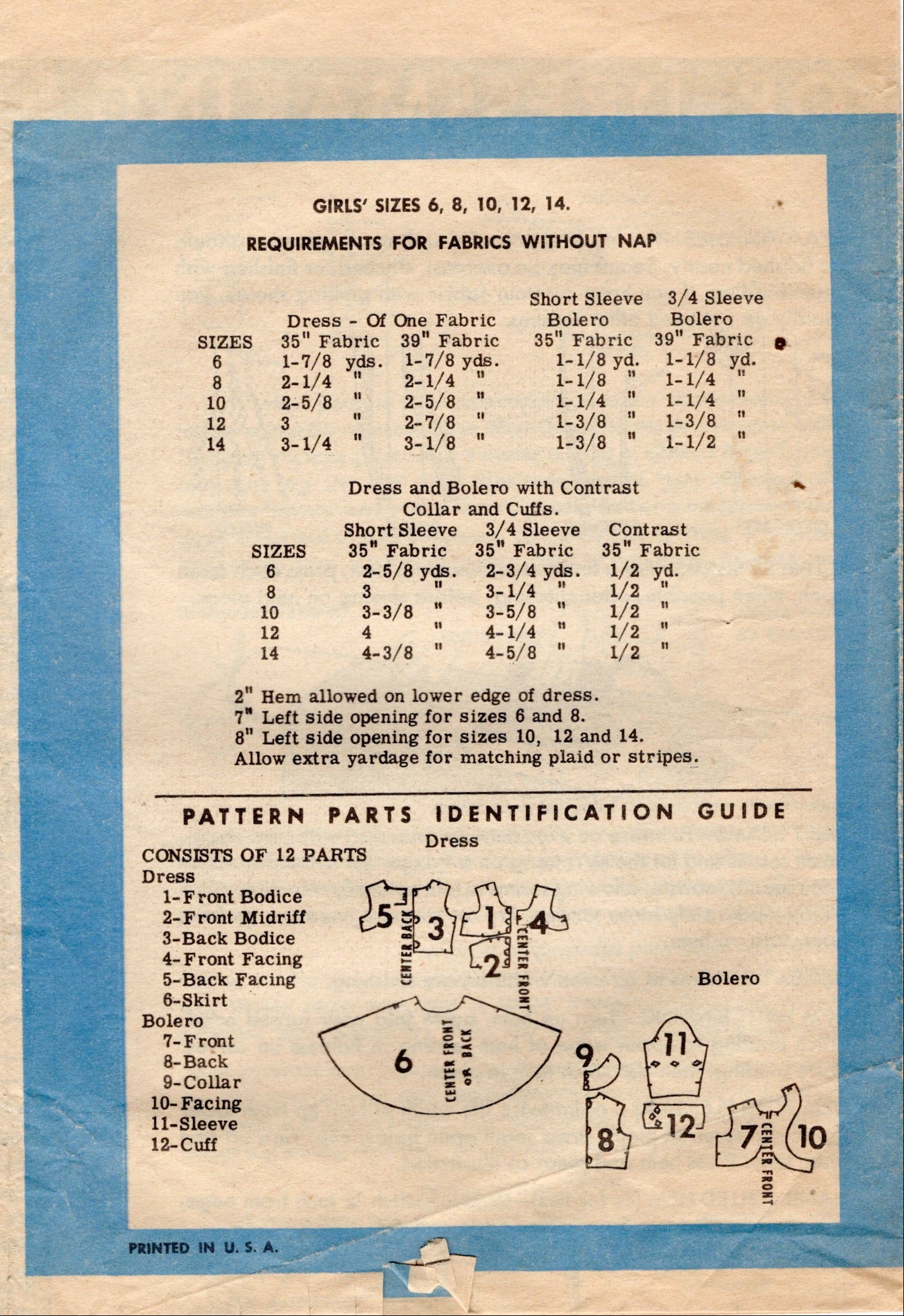 1950's Mail Order Child's Dress and Bolero Jacket Pattern - Chest 28" - No. 4649
