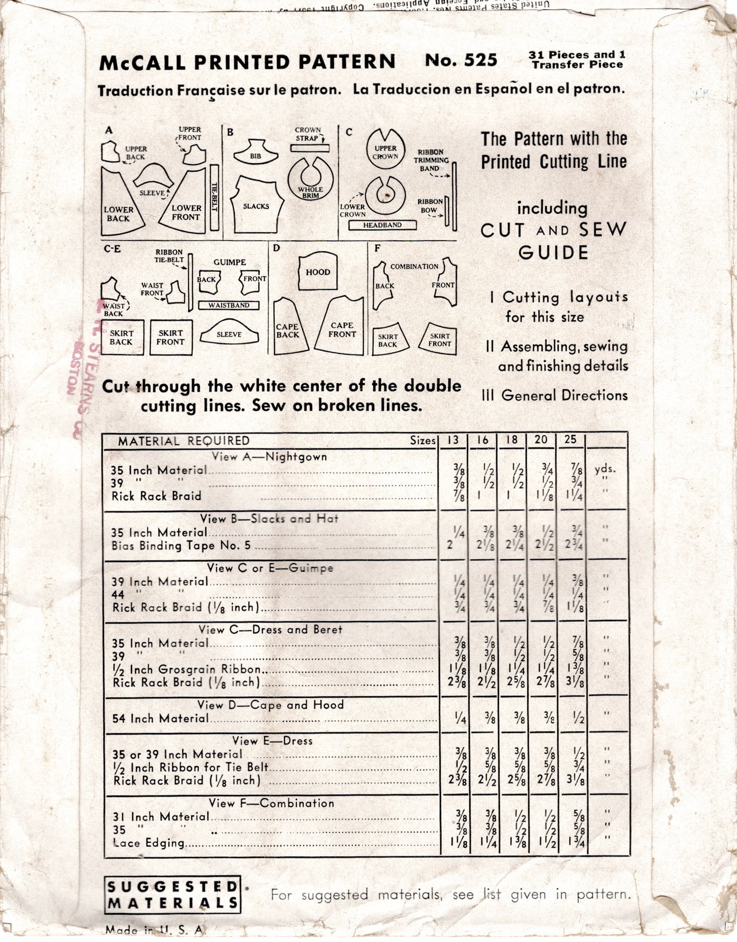 Nightgown, Slacks (jumpsuit) and floppy-brimmed hat, Guimpe (a blouse worn under a jumper or pinafore), Dress (jumper) and beret, Cape and hood