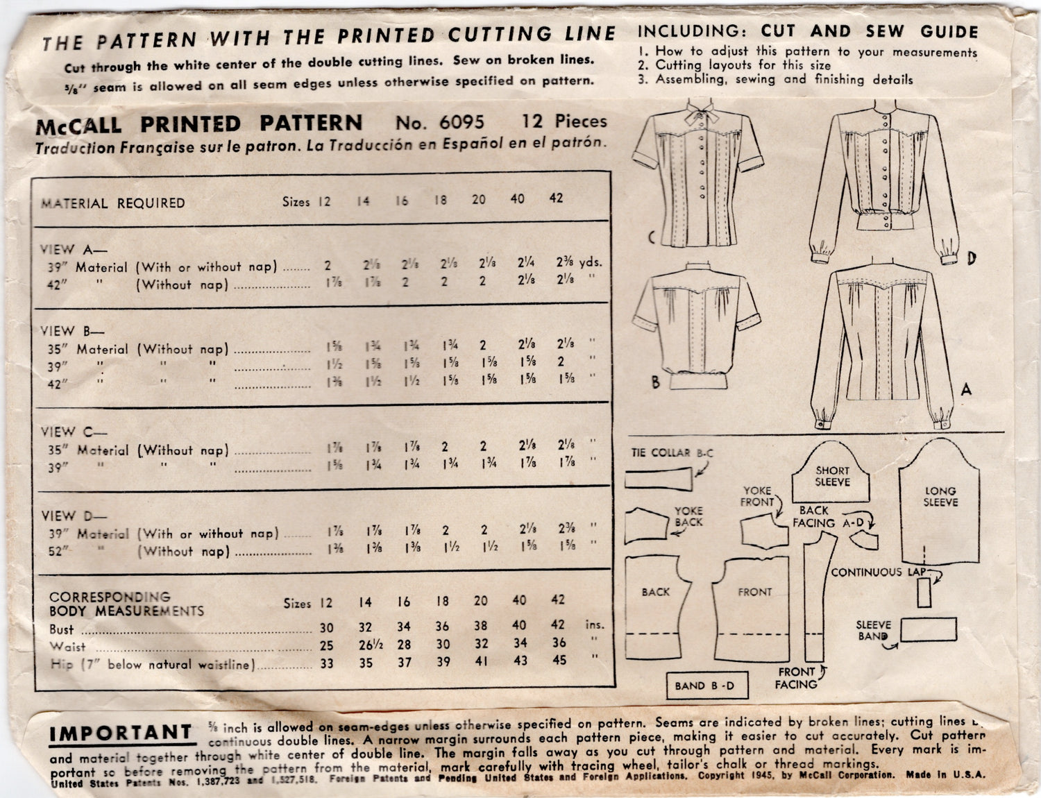 1940's McCall Button Up Blouse with Large Yoke and Pin Tucks - Bust 36" - No. 6095 is backordered and will ship as soon as it is back in stock.
