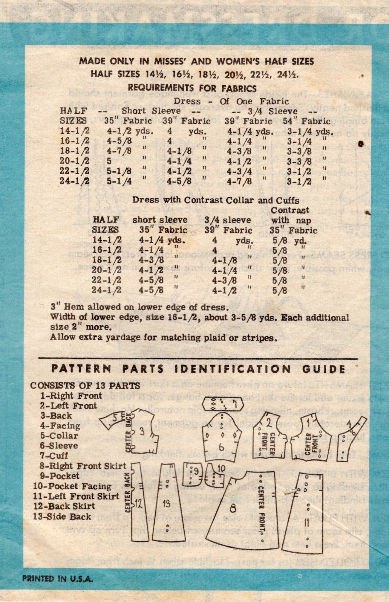 Featured in an ad from October 1, 1952: It's the side-swept buttoning, the graceful lines of this dress that make you look so much slimmer! Proportioned for the shorter, fuller figure - give thanks! No alteration problems! Sew this in fluid faille, collar and cuffs in contrast velveteen, if you wish.