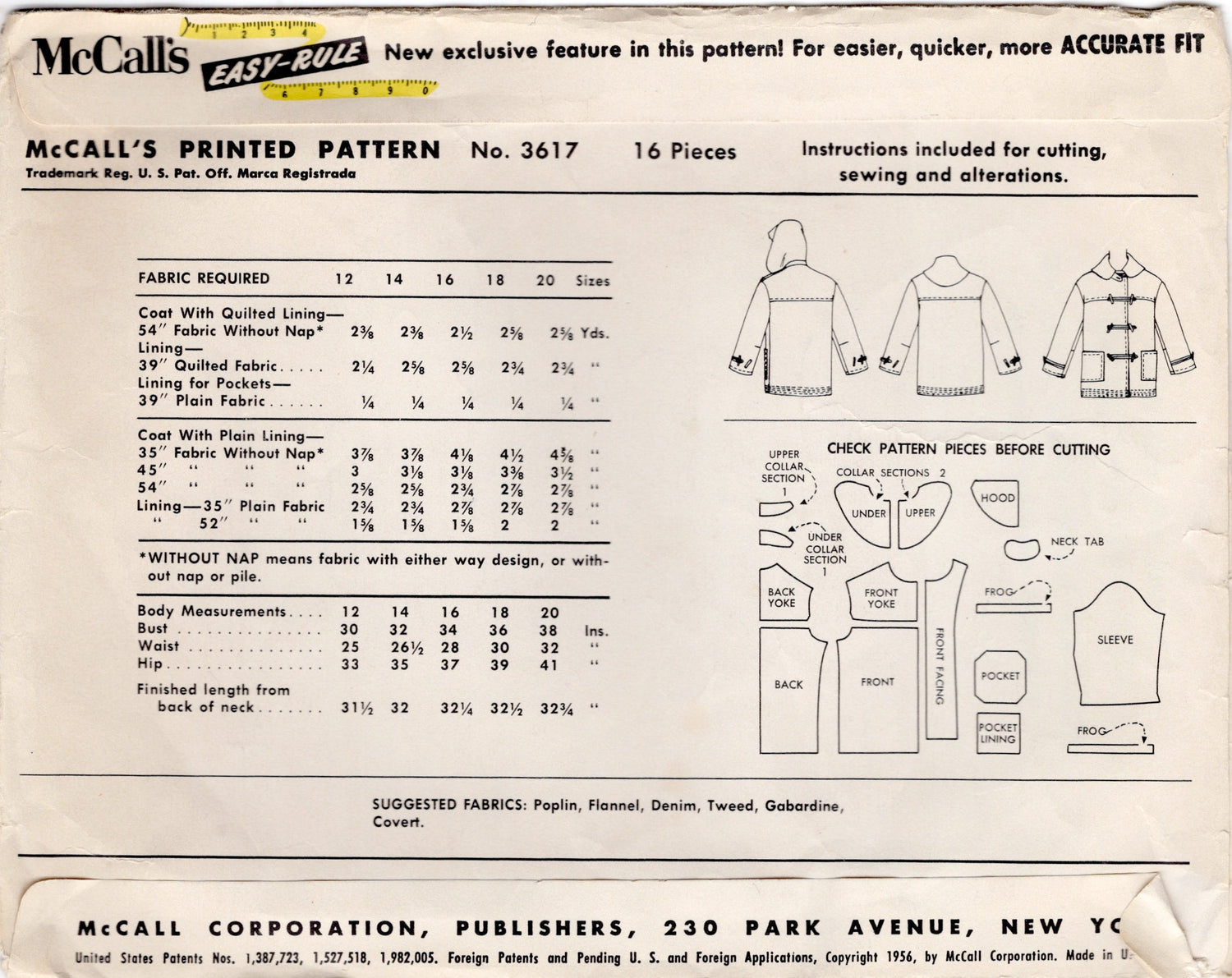 1950's McCall's Sport Coat with or without Attached Hood - Bust 30" - No. 3617 is backordered and will ship as soon as it is back in stock.