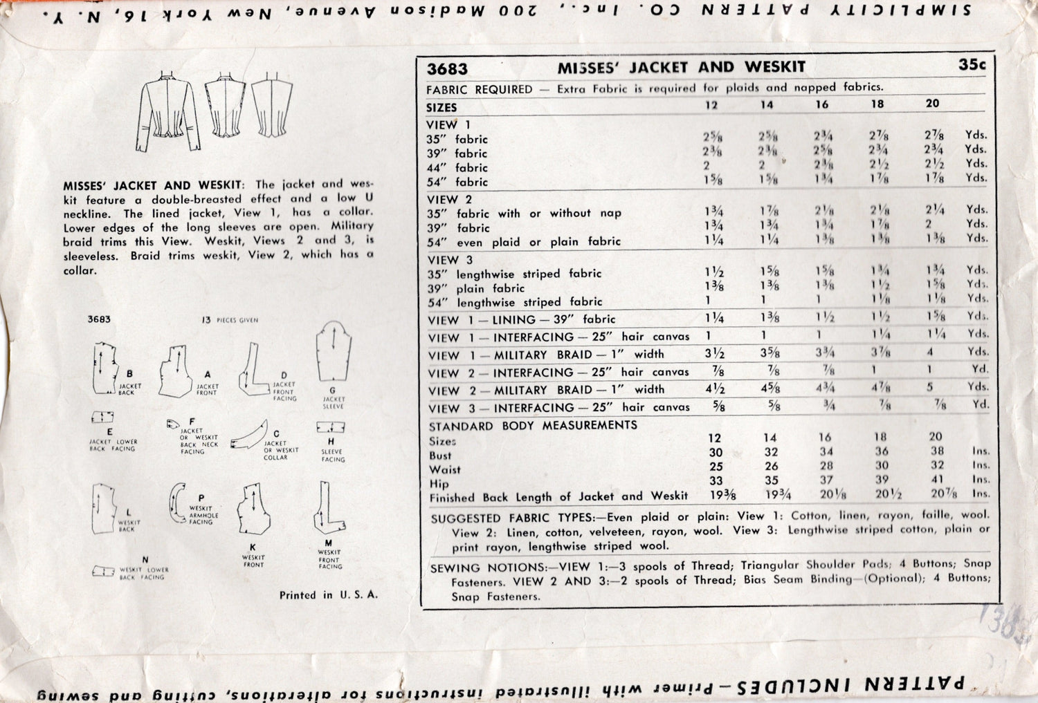 1950's Simplicity Weskit Vest and Jacket with Nipped Waist - Bust 30" - No. 3683 is backordered and will ship as soon as it is back in stock.