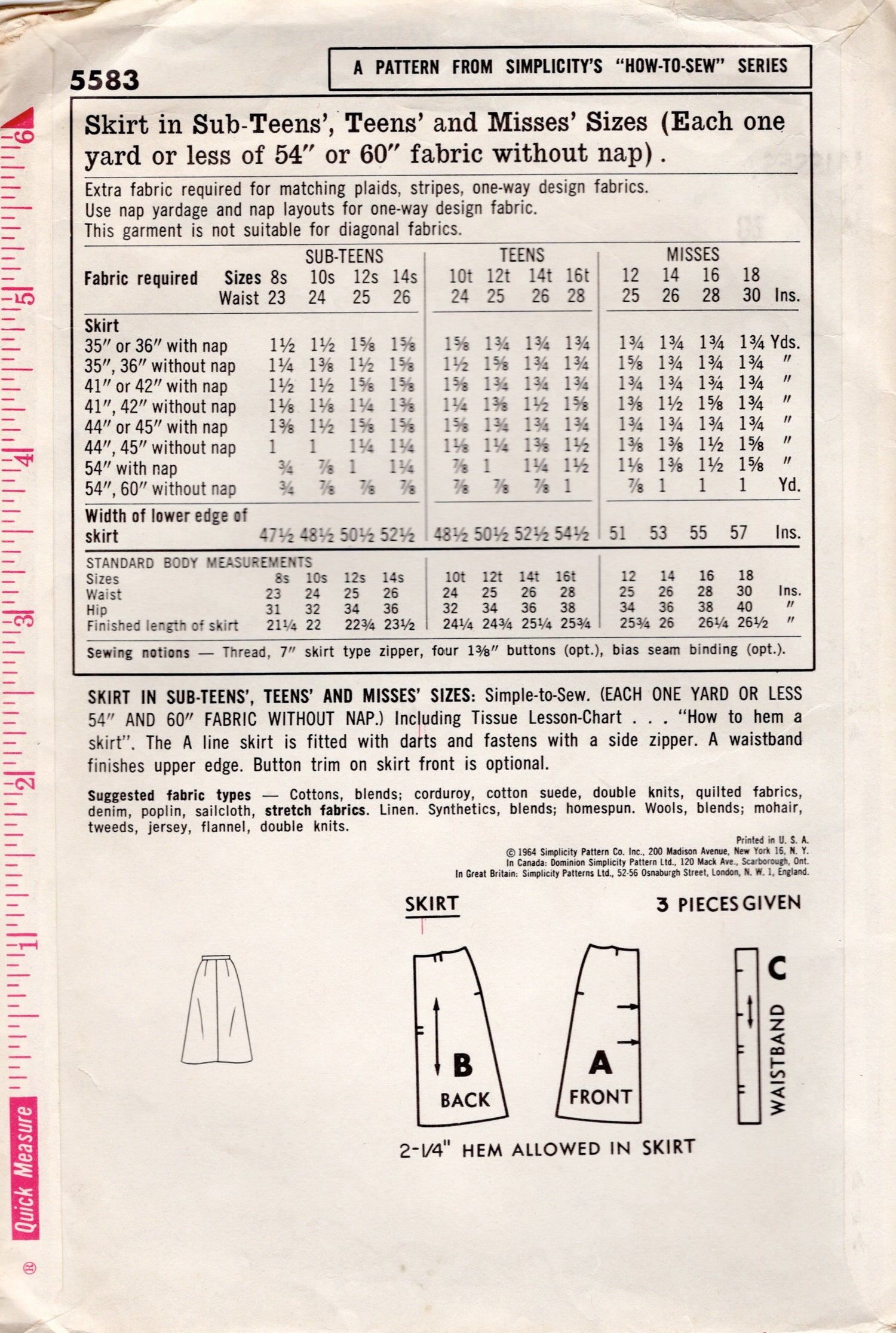 1960's Simplicity A-line Skirt Pattern - Waist 28" - No. 5583 is backordered and will ship as soon as it is back in stock.