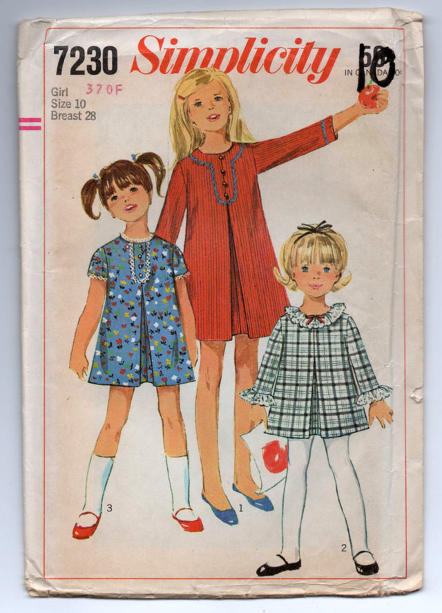 1960's Simplicity Girl's A-Line Dress with Two Sleeve Lengths Pattern - UC/FF - Breast 28" - No. 7230 is backordered and will ship as soon as it is back in stock.
